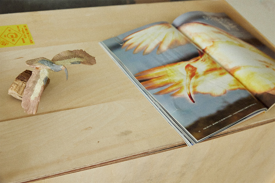 『トキダスト』。紙面に描かれたトキを部分的に消し、立体として出現させた作品