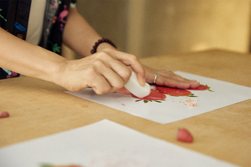 素材としての可能性を探るべく、消しゴムの種類や配合による質感の違いを確かめるなど、実験的な制作も重ねている入江さん。「ただ素材として使うのではなく、消したもとのイメージに宿る記憶や雰囲気を、形にしたい」と語る彼女に、制作の背景や気になっている素材についてうかがいました。
