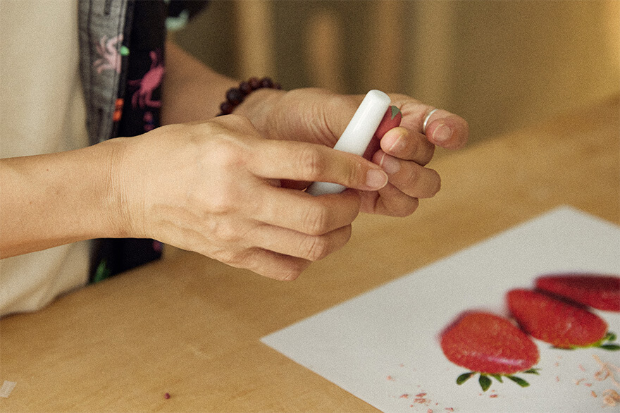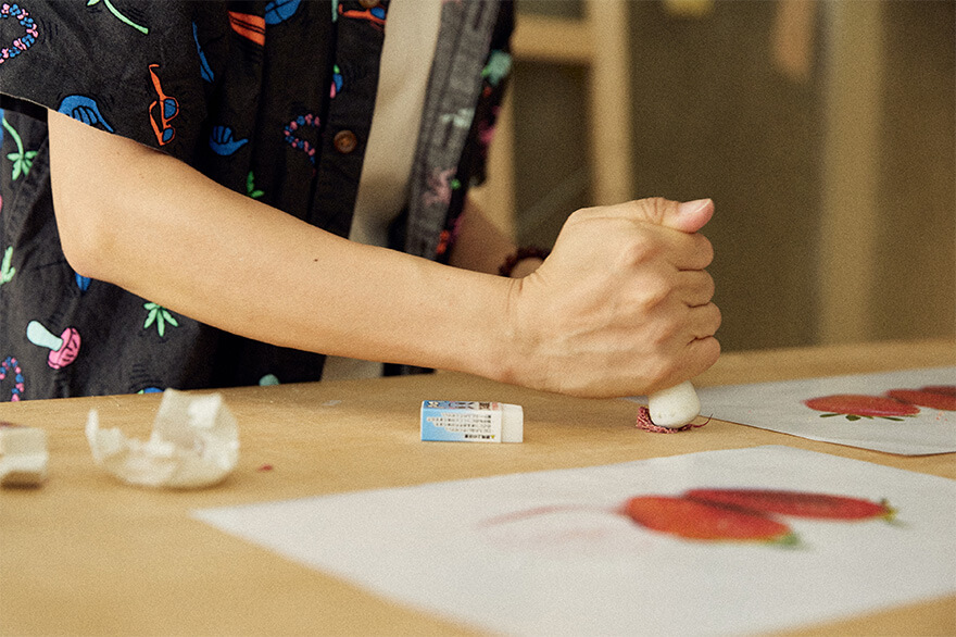 入江:そうですね。いろいろ試した結果、塩ビと非塩ビ、それぞれの消しゴムを混ぜると、粘土のようにやわらかくまとまることがわかったんです。1種類だけだとボソボソして扱いにくくて。理由はわからないのですが、感覚的にしっくりきて、それ以来この方法でつくっています。