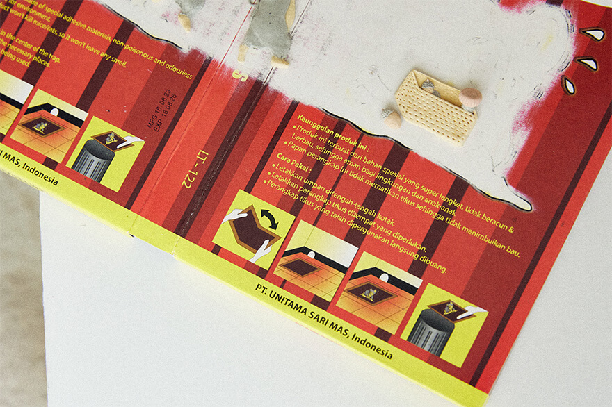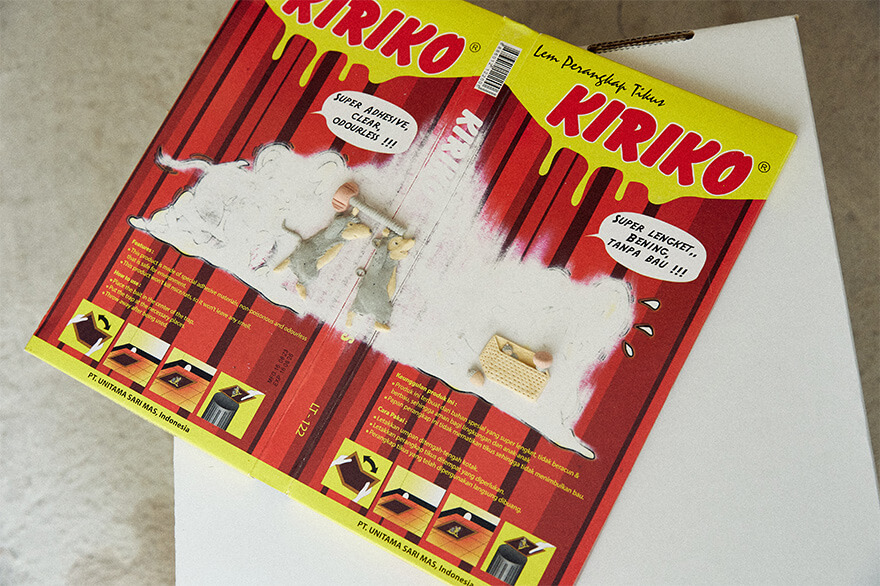 これはネズミ捕りのパッケージがもとになっていて、オリジナルのイラストではネズミが捕えられて苦しそうな様子で描かれていました。もうちょっと前向きな表現にできないかと思って、現地の方に聞いたお話をもとに立体化しました。