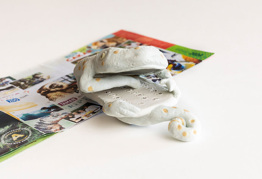 『ジョグジャ物語 -トッケイヤモリ-』。動物園の園内ガイドから飛び出したヤモリがモチーフ。よく見ると、携帯電話と同化している(写真提供:入江早耶)