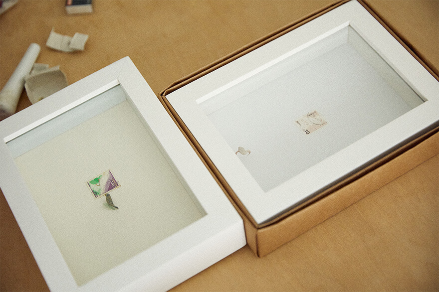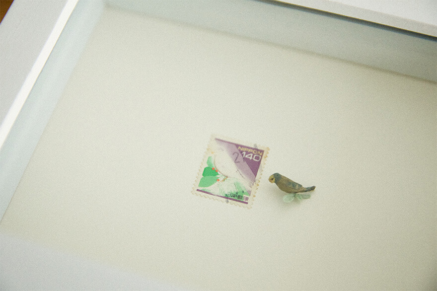 『イカルダスト』(左)と『トキダスト』(右)。切手に描かれたイカル(鳥)やトキも消して立体に
