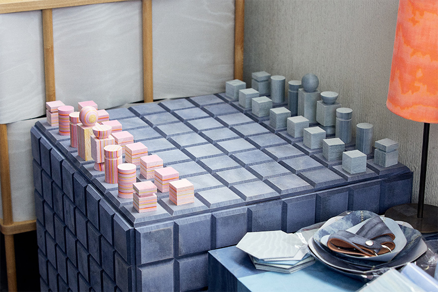 姫井:色調の異なる数百枚の廃棄布とサトウキビ由来の熱可塑性樹脂フィルムを交互に積み重ね、加熱とプレスによって樹脂を溶かして製作します。完成した素材は、削り出して使うブロック状のものと、加工しやすいシート状のものの2種類。