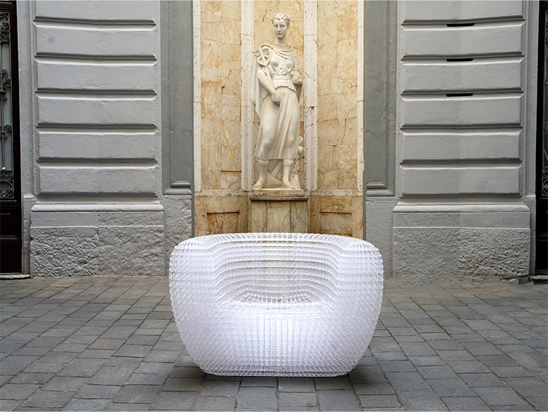 遠目にはモダンとクラシックが融合したシルエットに見え、座ると荘厳な建築物の内部に腰かけている感覚になる、まるで小さな建築のような家具です。