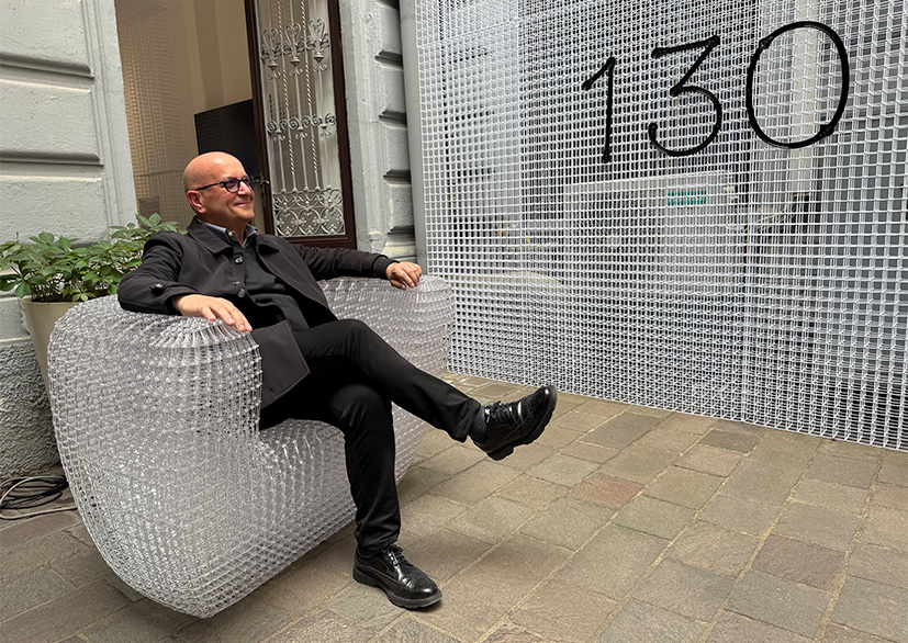 加藤大直(以下、加藤):これは、「130(ワンサーティ)」というデザインブランドの作品です。このプロダクトは、クラシックなフォルムを踏襲しつつ、「130」独自の流れるような格子トポロジーをあらわした、アームつきラウンジチェアです。