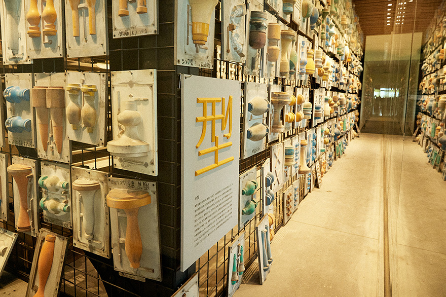 エントランスを抜けて正面に現れる「木型」の展示。鋳物製品を生み出す大元になる型で、高岡にある木型屋ごとに色分けがされている