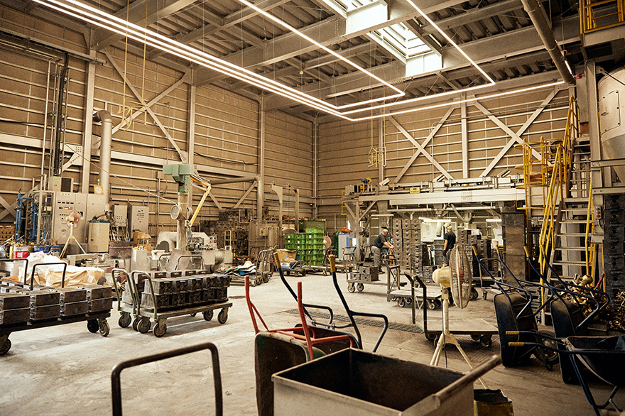 鋳物場では、木型から実際に金属を流し込むための「砂型」を造形。その砂型に金属を流し込む「鋳造」の作業、砂型から製品を取り出す「型ばらし」の作業が行われています。