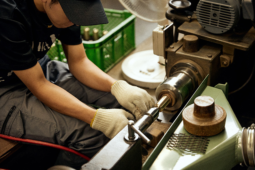 真鍮の仕上げは、まずバリや突起物を大まかに取り除く「洗い」と呼ばれる作業から。次に、旋盤機を使って表面を「削る」工程へ。
