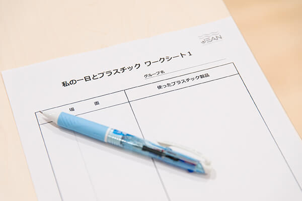 今回のワークショップのテーマは「私の一日とプラスチック」。朝起きてから出勤し、仕事をして帰宅、就寝するまでにどれくらいのプラスチック製品を使用しているかを6つの班ごとに手分けして書き出していく作業に取り組みます。